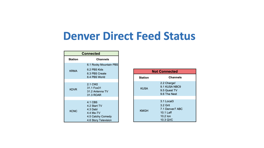 MetRec is moving to Denver Direct Feed service as a result of external celluar 5G signals interfering with satellite feeds that delivered channels to MetRec. Users may need to rescan their televisions to receive all working channels.
